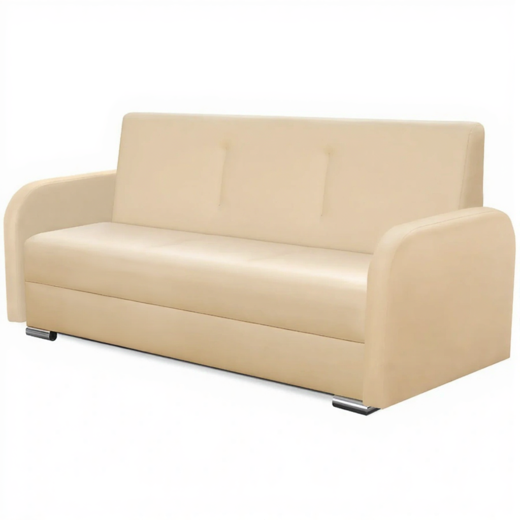 Обивка доступна в различных вариантах искусственной кожи категорий "Эконом", "Стандарт" и "Элит", что дает возможность подобрать идеальное решение, соответствующее вашим предпочтениям и стилю интерьера. Элегантные хромированные опоры добавляют дивану изысканности.