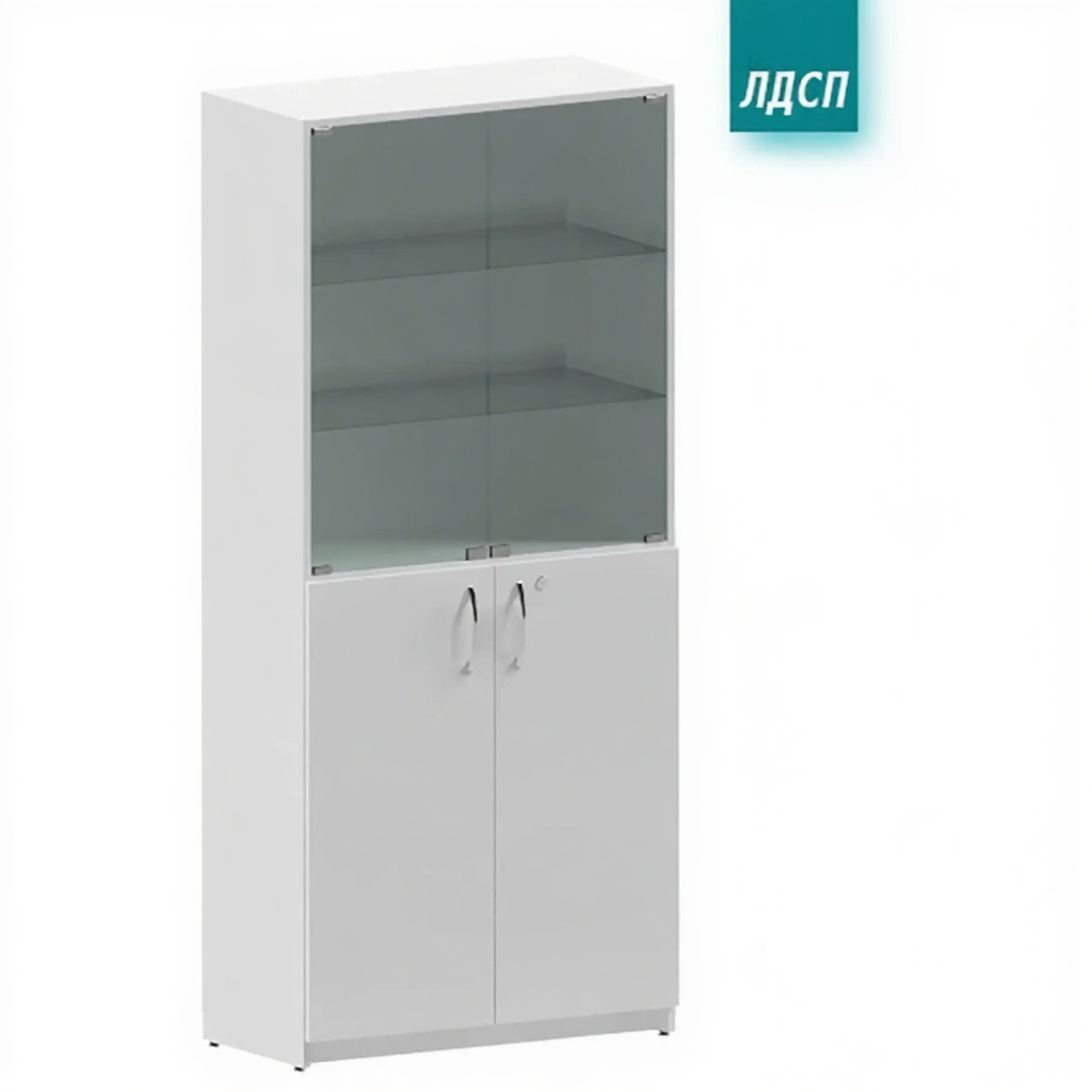 • 2 дверцы (нижние) из ЛДСП, 2 дверцы (верхние) из стекла, 2 полки (в нижней секции) из ЛДСП, 2 полки (в верхней секции) из стекла;