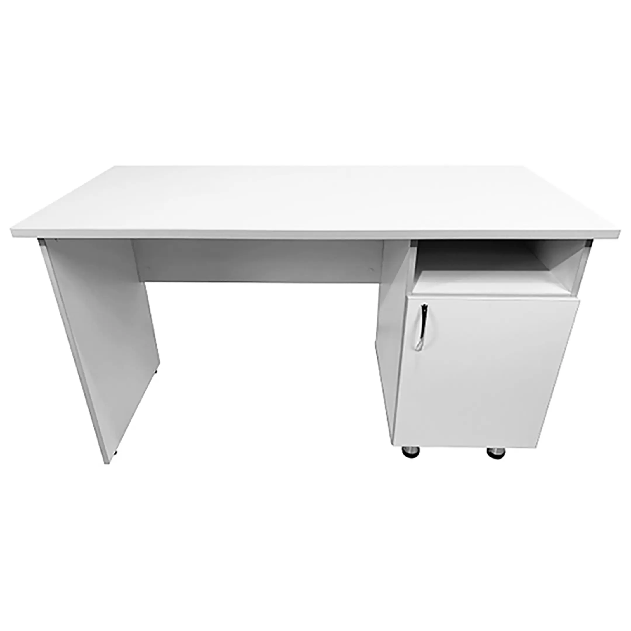 • Стол оснащен боковой тумбой, оборудованной верхней открытой нишей и вместительным отделением с полкой, закрытым распашной дверкой.