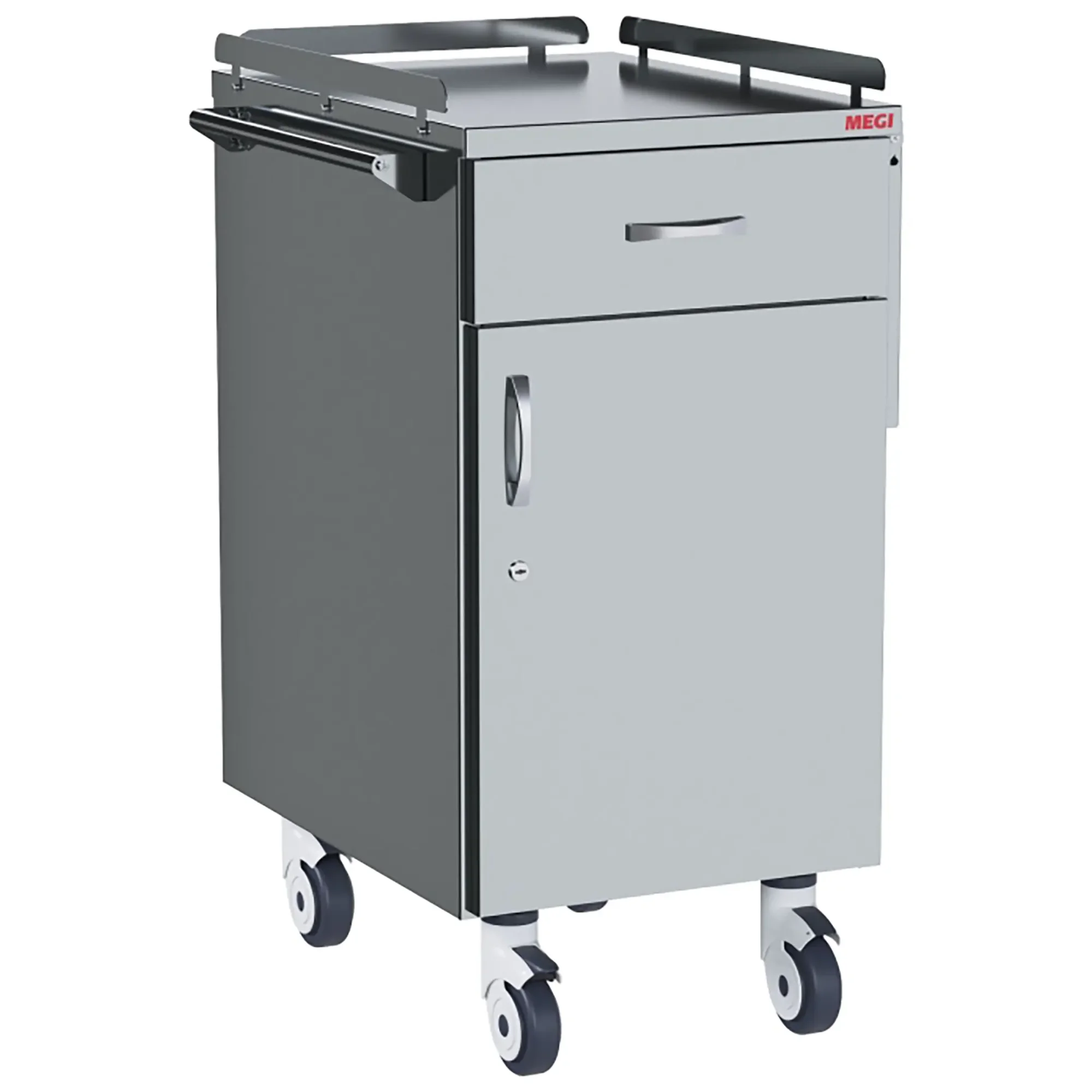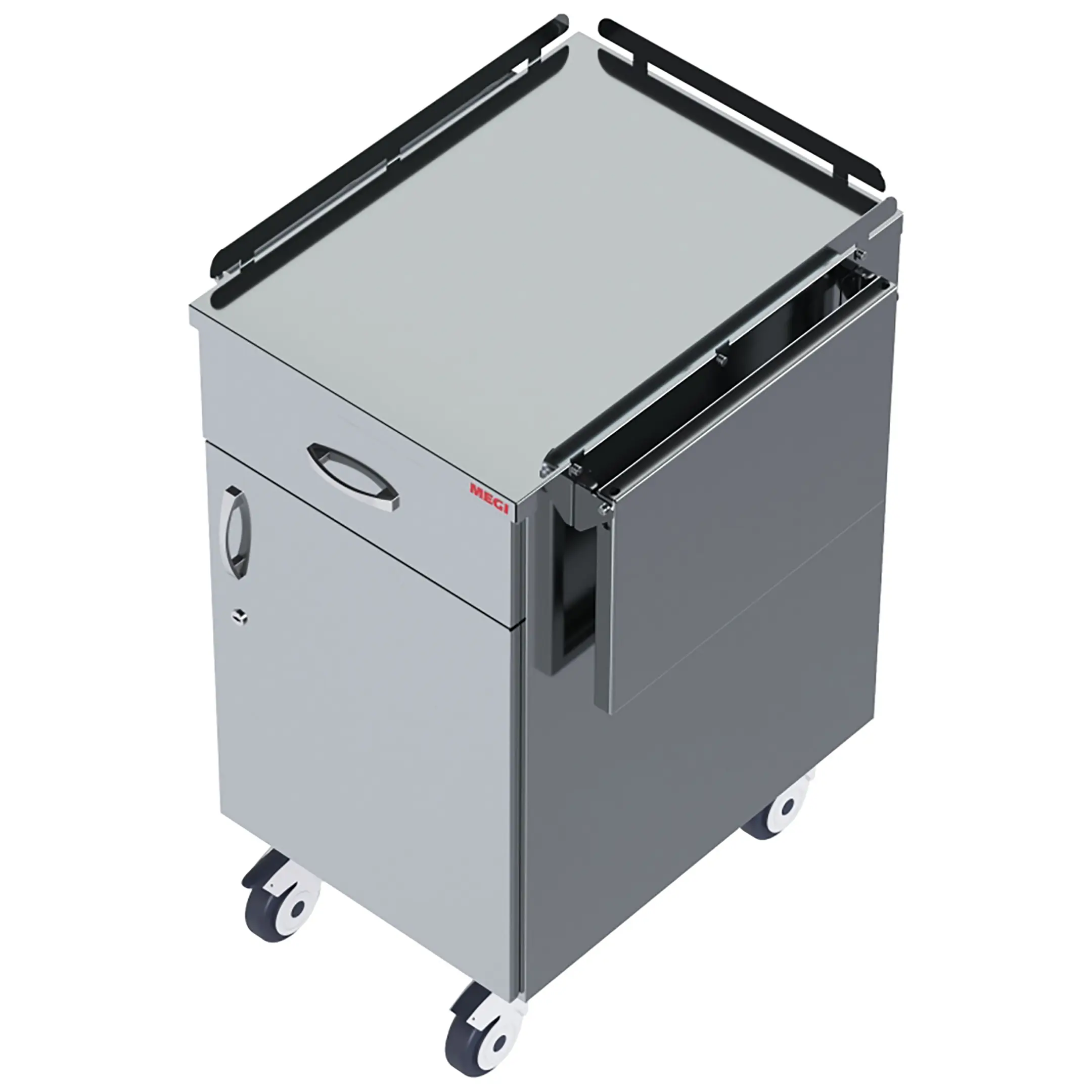• колеса поворотные, самоориентирующиеся, диаметром 100 мм, комплектуются надёжной стальной вилкой с прецизионным радиально-упорным подшипником, ободом из полипропилена и шинкой из серого полиуретана, не оставляющего следов на полу, два колеса – с индивидуальным тормозным устройством;
