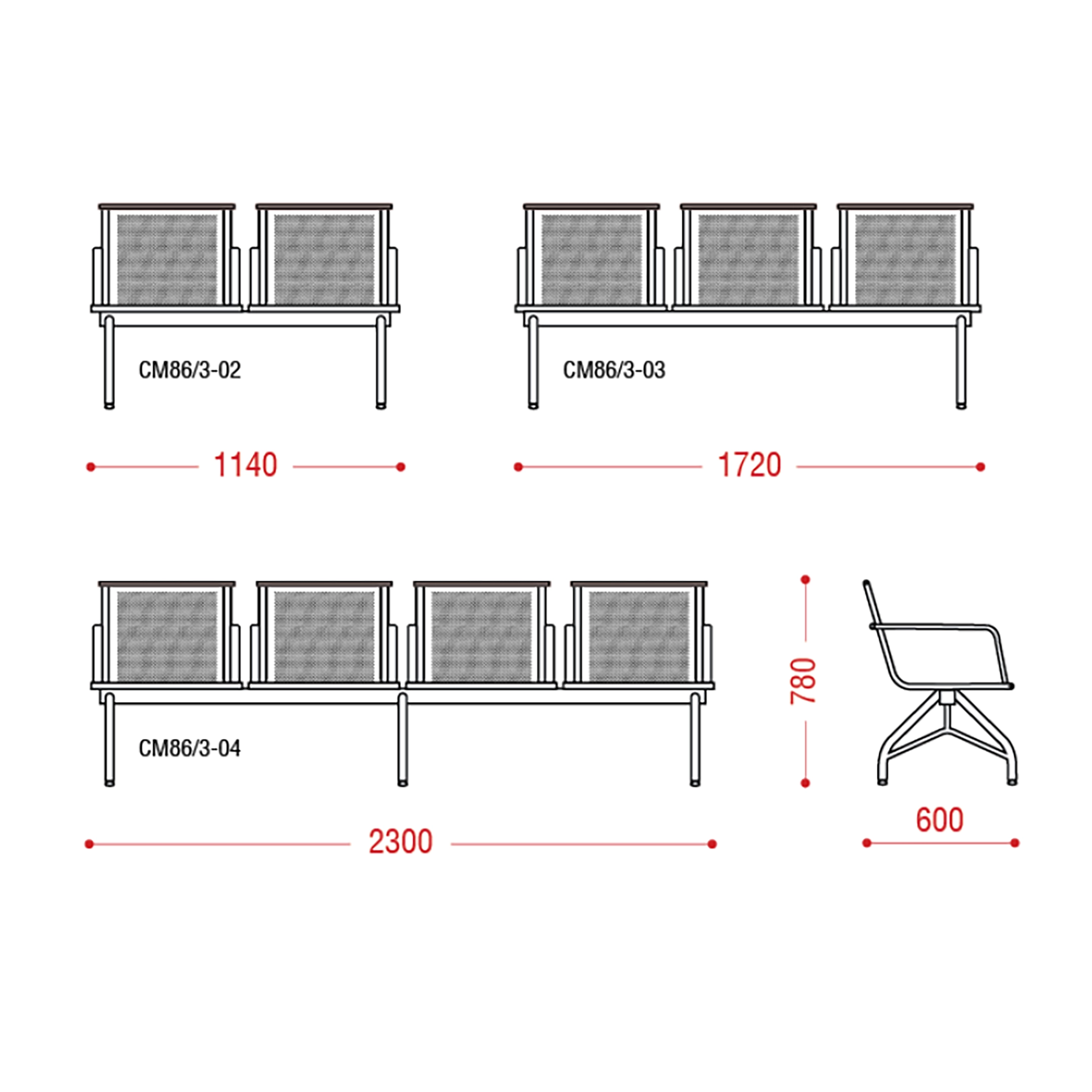 Это элегантная многоместная секция мебели представлена на прочном металлокаркасе, выполненном из качественных материалов: основной элемент — труба диаметром 60х60 мм, усиленная дополнительными элементами (трубы диаметром 19, 22, 30 мм и профильно-овальные элементы размером 30х15 мм).