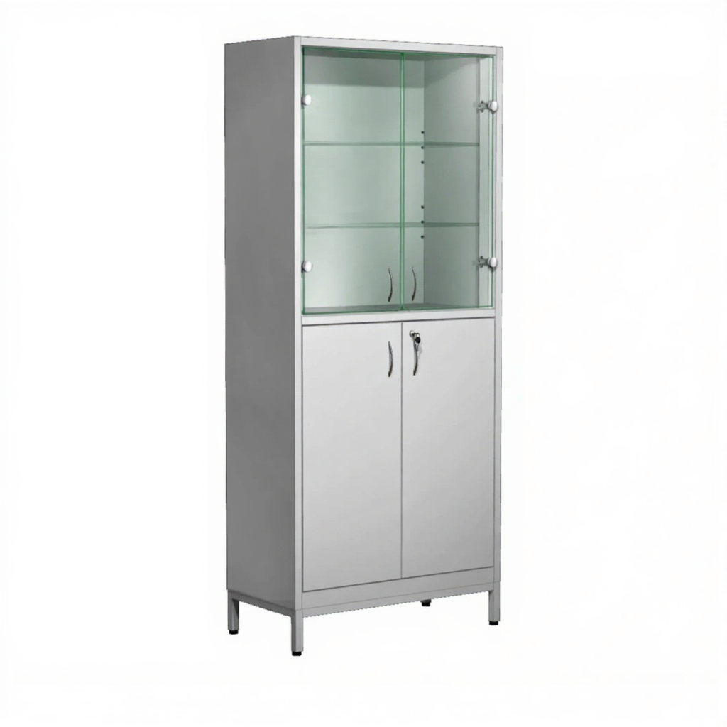 - Комбинированная конструкция — верхняя секция со стеклянными дверками и полками для визуального контроля, нижняя секция с металлическими дверками и замком для безопасного хранения.
