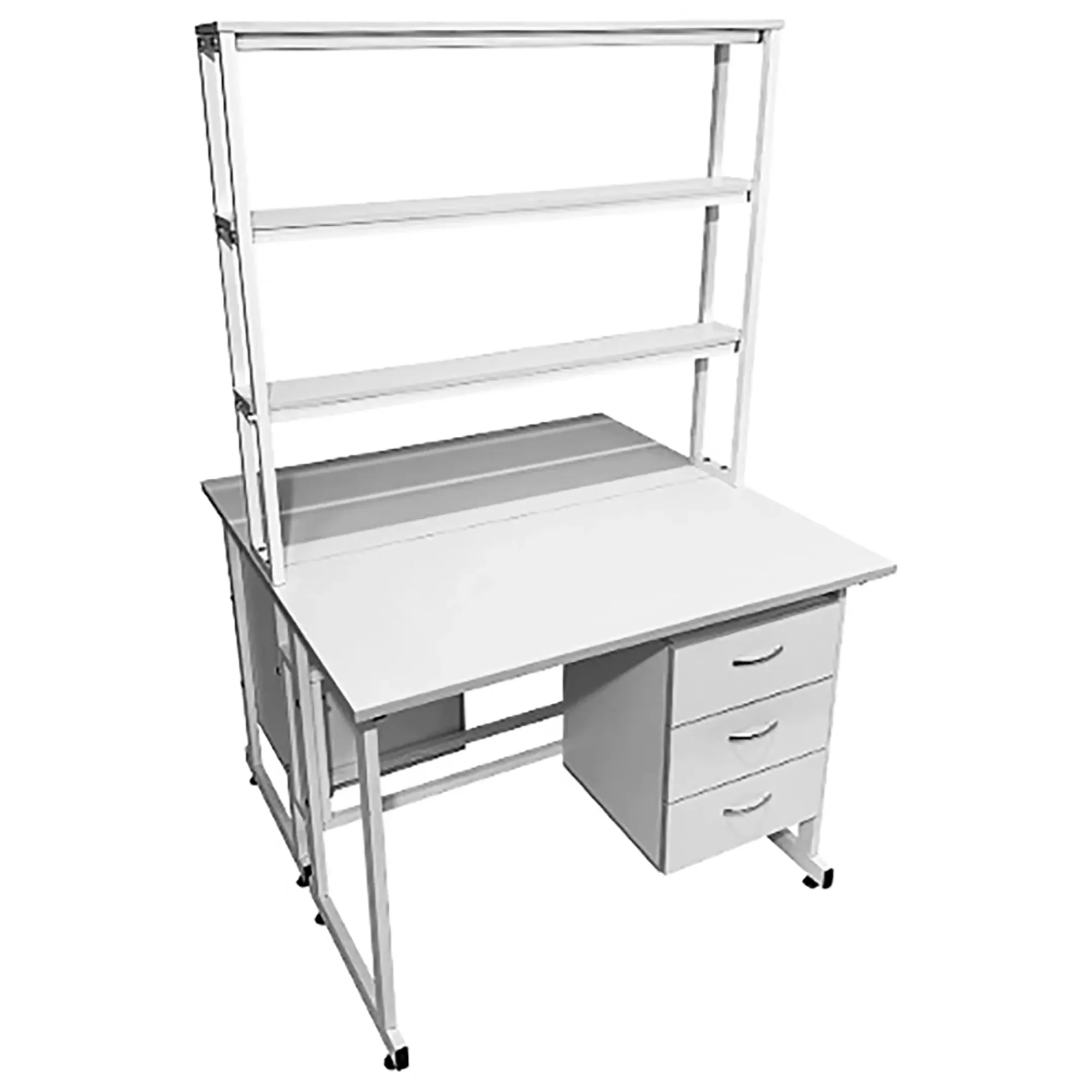 Стол лабораторный островной с надстройкой Сло 22.021 (белый) — это идеальное решение для организации двух рабочих мест в лабораториях или медицинских учреждениях. Модель оснащена двумя рабочими местами, каждое с подвесной тумбой с тремя выдвижными ящиками, и центральной надстройкой с тремя полками. Каркас выполнен из стального профиля, столешницы из ЛДСП толщиной 22 мм.