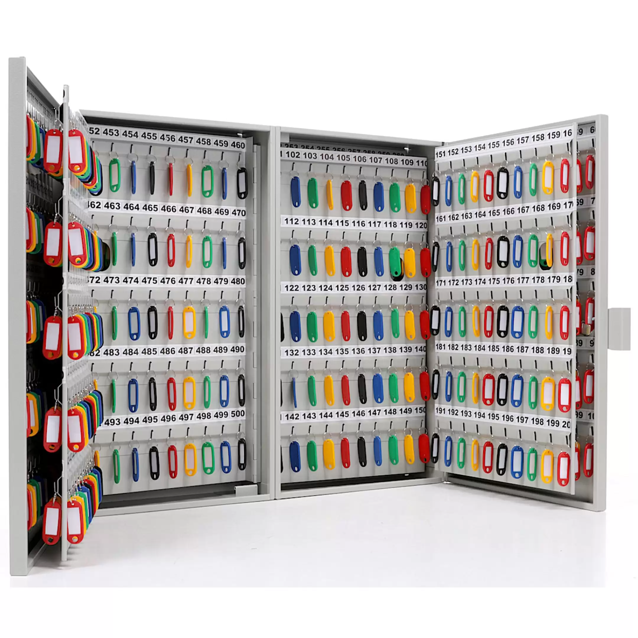 Ключница KEY-600 (с брелками) — это масштабная и профессиональная система для централизованного управления, учета и хранения чрезвычайно большого количества ключей на особо крупных объектах, в головных офисах управляющих компаний, на промышленных гигантах и в распределенных сетях. Модель представляет собой крупногабаритный металлический шкаф (часто напольный или модульный), где обозначение «KEY-600» прямо указывает на её экстремальную вместимость (600 ключей), а комплектация «с брелками» включает полный промышленный набор номерных держателей. Конструкция предназначена для создания главного узла ключевого хозяйства, обеспечения безусловного порядка, максимальной безопасности и интеграции в сложные системы электронного документооборота и контроля доступа.