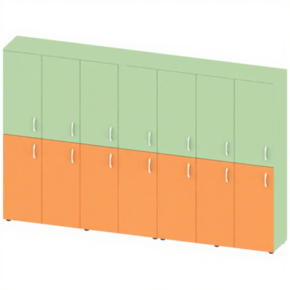 Шкаф детский для одежды двухъярусный на 7 секции МБ-ШК-16 — это функциональное решение для хранения одежды в детских садах, школах и других дошкольных и образовательных учреждениях. Модель имеет 7 секций, каждая из которых разделена по горизонтали на 2 равные ячейки с индивидуальными дверями и полками.