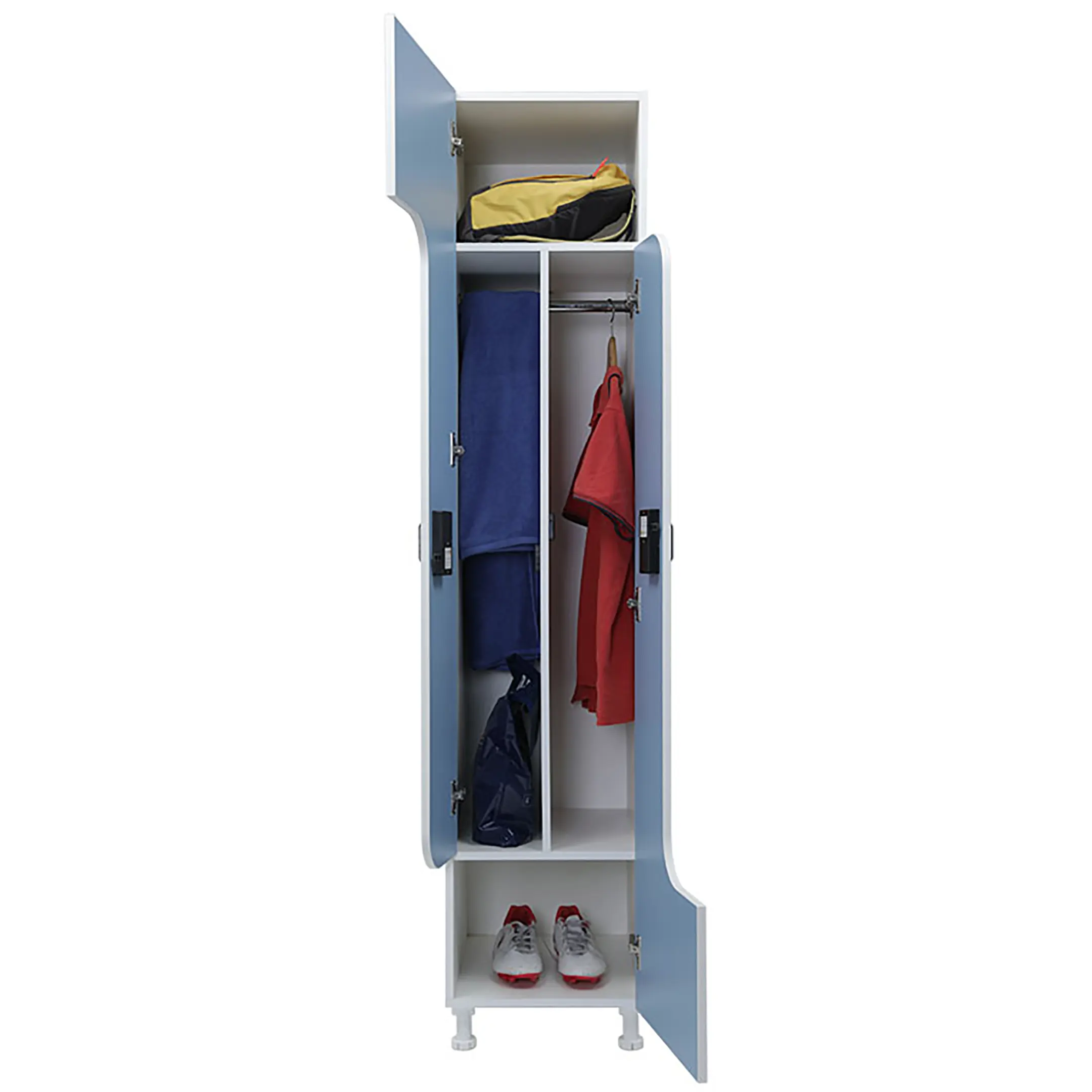 Шкаф для раздевалок WLZ 21-40 EL голубой/белый — это функциональное решение для хранения одежды в производственных, спортивных и других помещениях, хозяйственного инвентаря, а также для организации камер хранения. Особенность модели — возможность установки большого количества индивидуальных ячеек в ограниченном пространстве благодаря ширине ячейки 200 мм, позволяющей использовать вешалки-плечики, и увеличенной верхней или нижней части шириной 400 мм для обуви и сумок.