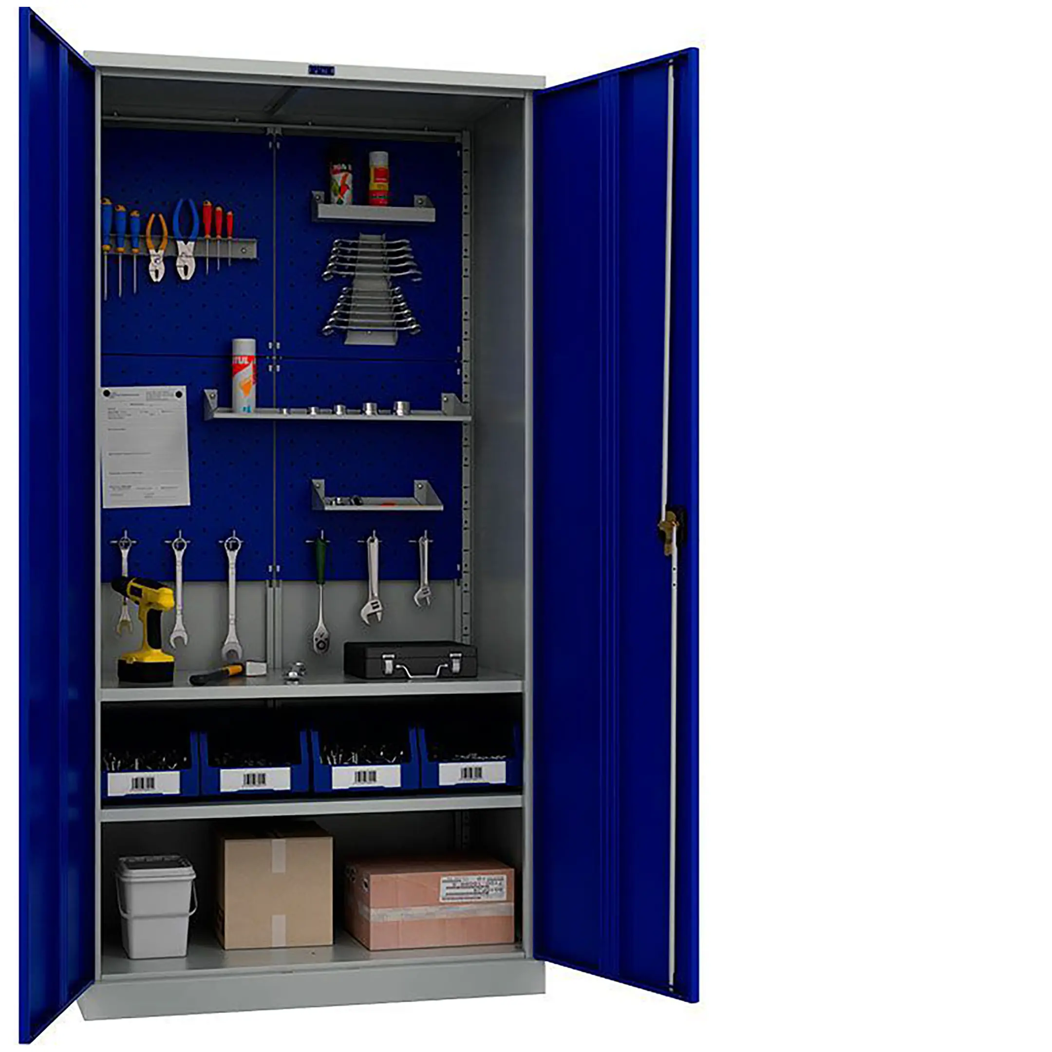- Максимальная организация и наглядность — модель оборудована обширными перфорированными панелями (система «перфо») на дверцах и, как правило, на задней стенке. Это позволяет удобно, компактно и наглядно разместить огромное количество инструмента на крючках и держателях, обеспечивая мгновенный визуальный контроль его наличия и комплектности.