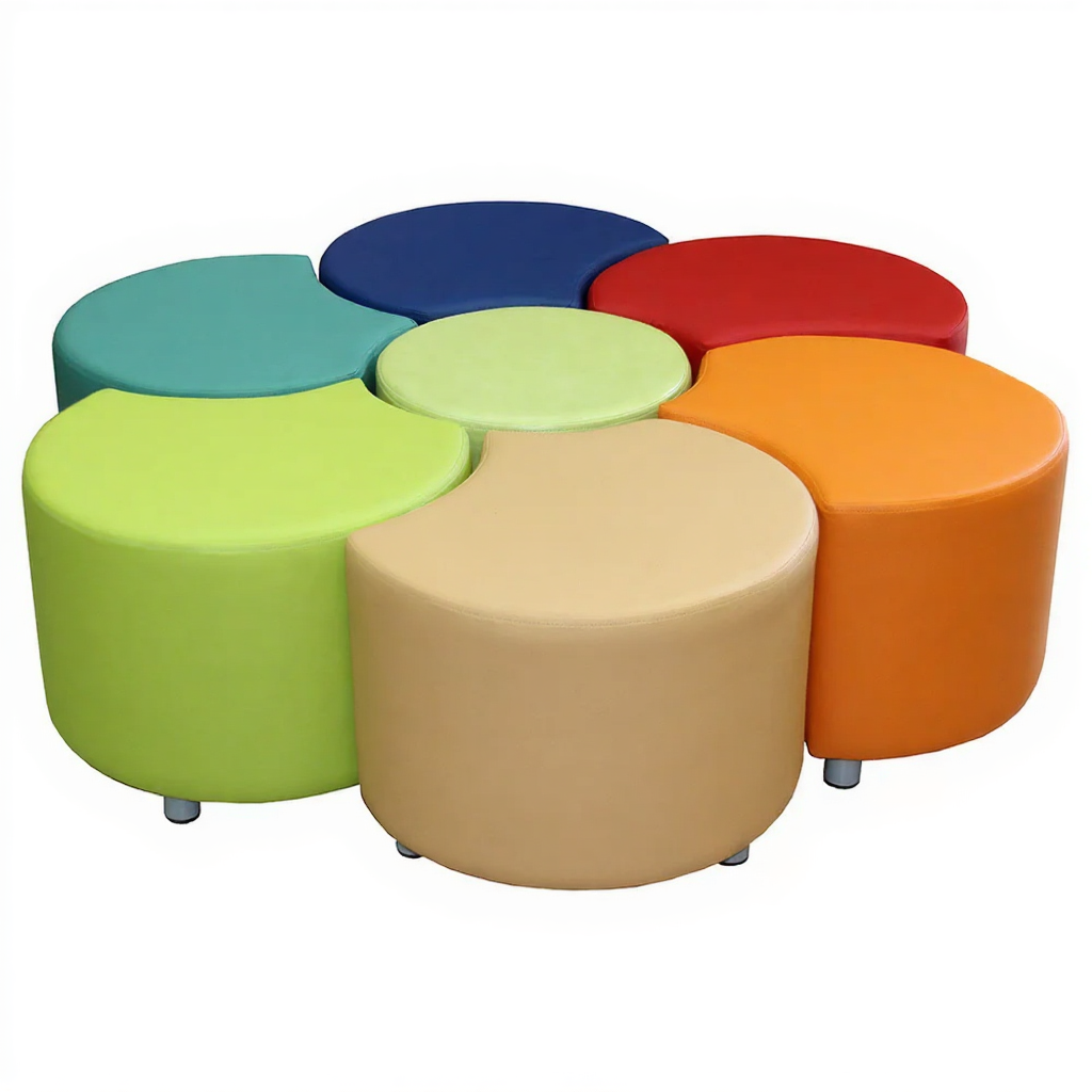 Пуфы «Семицветик» — яркие и многофункциональные модули для оснащения детских образовательных учреждений, игровых комнат и развивающих центров. Каркас пуфов выполнен из прочного металла с безопасным покрытием, что обеспечивает устойчивость и долговечность конструкции. Сиденья изготовлены из качественных материалов с мягким наполнителем в семи различных цветах, гарантирующим комфорт и безопасность при использовании. Модель отличается ярким дизайном, мобильностью и возможностью комбинирования цветов для создания развивающей среды.