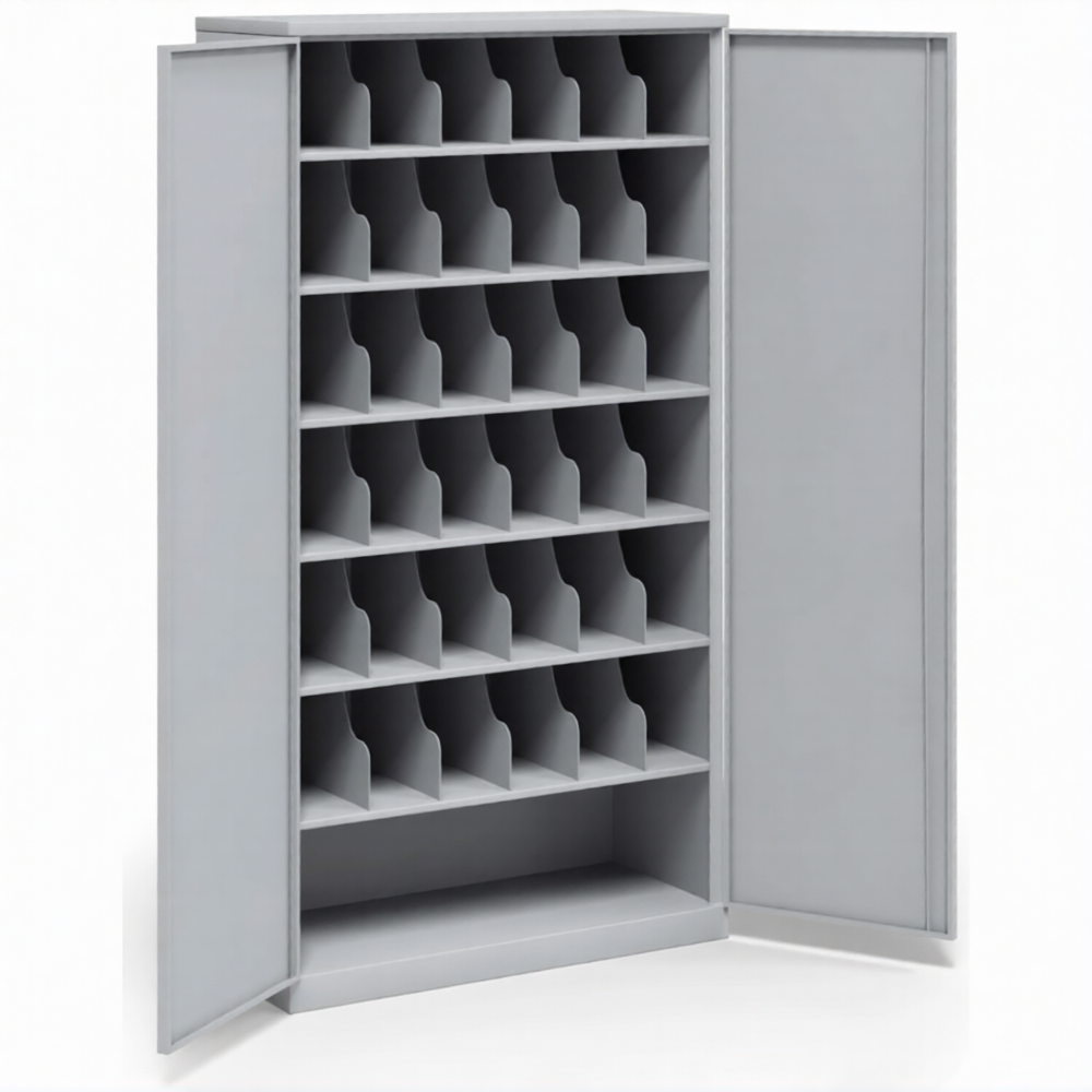 • Свободная нижняя ниша - высота 275 мм. Две дверцы, скошенные полки для удобства хранения СИЗ.