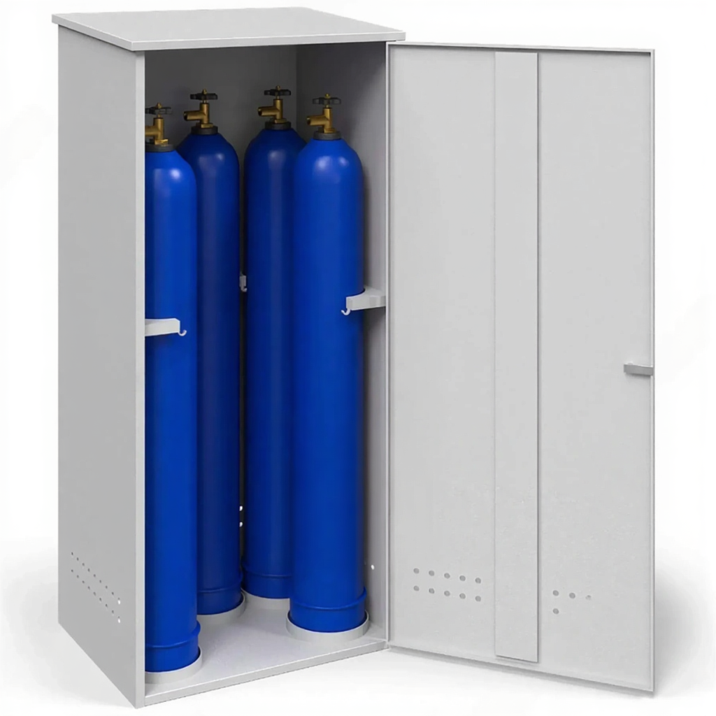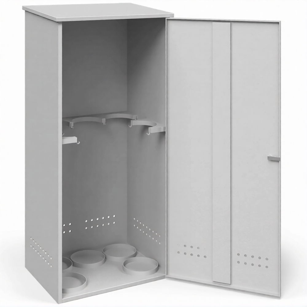 - Универсальная вместимость и компактность — шкаф рассчитан на хранение пяти стандартных газовых баллонов, что покрывает потребности большинства небольших и средних производственных участков, сварочных постов и мастерских. Его классические пропорции позволяют удобно разместить оборудование, не занимая излишнюю площадь, и обеспечивают легкий доступ для замены баллонов.