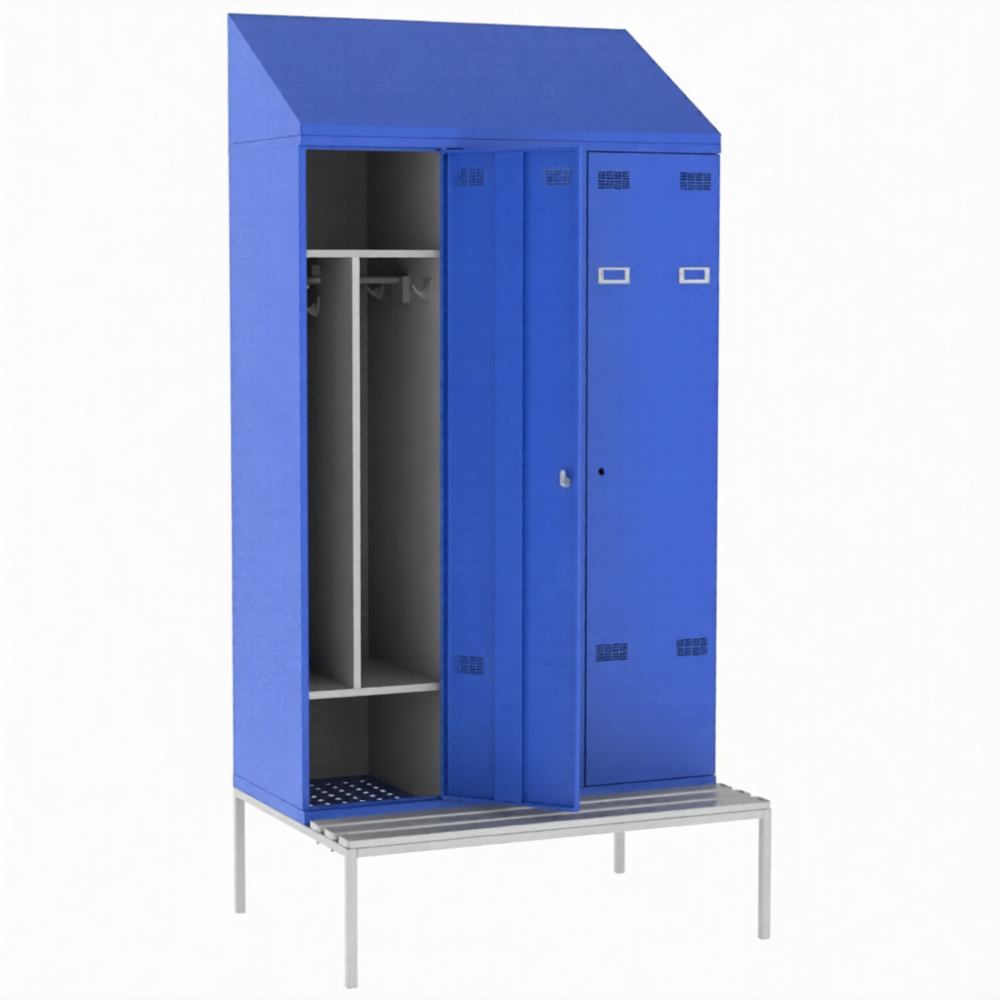 • Шкаф металлический для хранения одежды имеет сварную конструкцию. Для удобства проведения влажной уборки под шкафом модель установлена на подставку. Для удобства переодевания имеет скамью