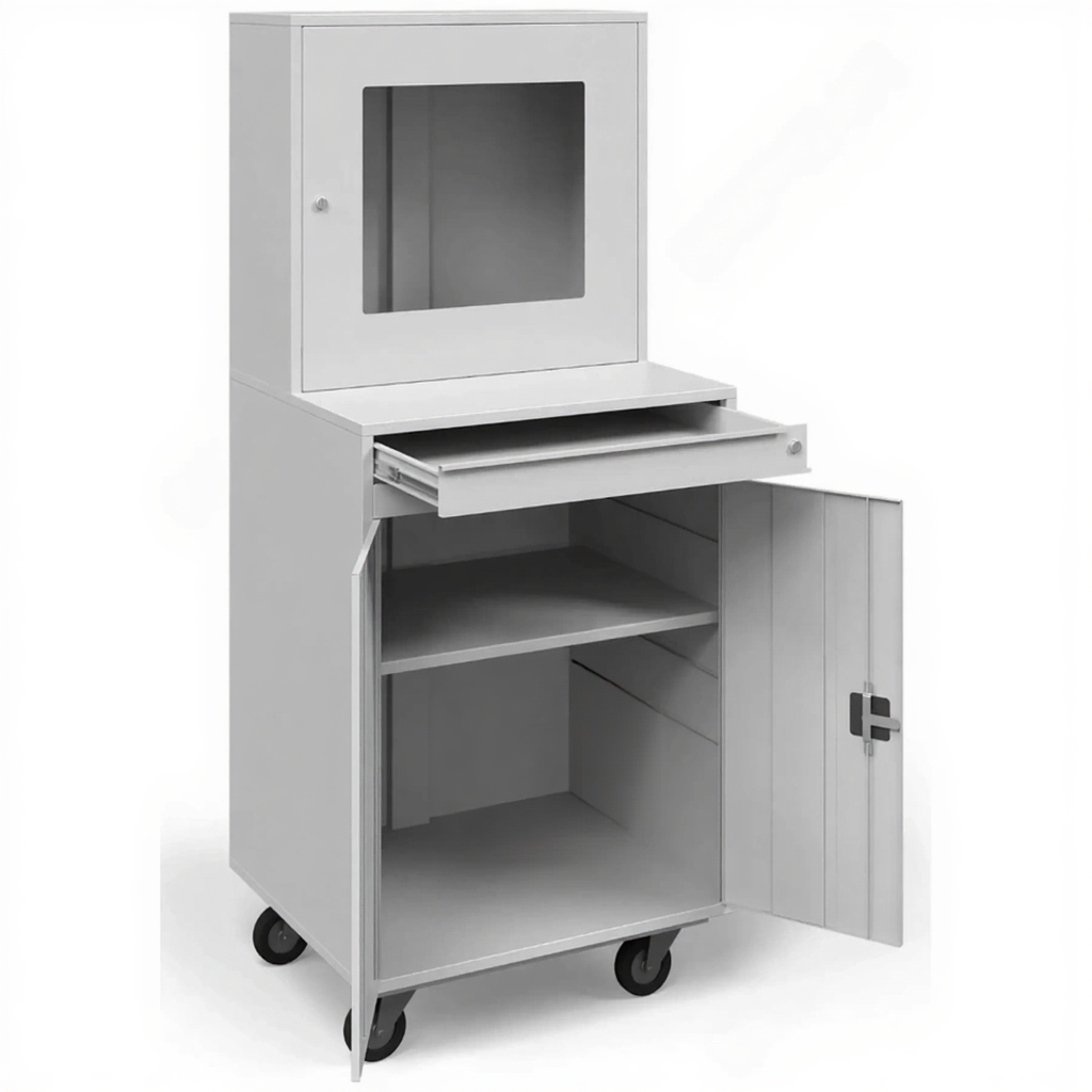 Шкаф компьютерный металлический под ЖК монитор (1732x720x600) — это специализированное и эргономичное решение для компактной и безопасной организации автоматизированных рабочих мест (АРМ) или информационных киосков в учебных заведениях, офисах, регистратурах и общественных пространствах. Модель с габаритами 1732x720x600 мм представляет собой высокий металлический шкаф, в верхней части которого предусмотрено место для монтажа ЖК-монитора, а внутри и снизу — для размещения системного блока, клавиатуры, документов и другого оборудования. Конструкция предназначена для создания защищенных, организованных и эстетичных точек доступа к информации.