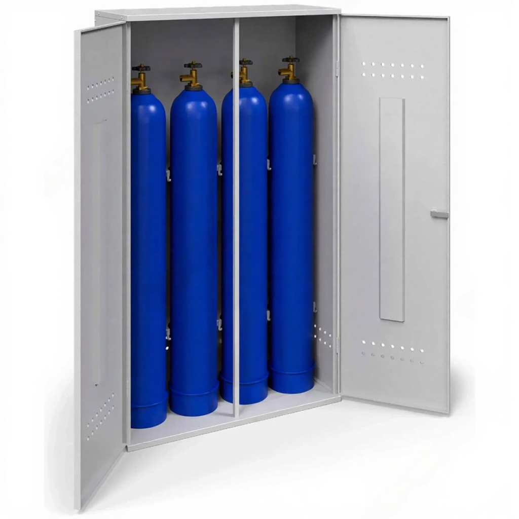 - Обеспечение базовых требований пожарной безопасности — металлический корпус толщиной 1,2 мм обеспечивает необходимую изоляцию баллонов от случайных источников возгорания и искр. Конструкция предусматривает перфорацию или вентиляционные отверстия для естественного воздухообмена, что помогает рассеивать возможные утечки газа и снижает риск создания опасной концентрации, отвечая ключевым требованиям ППР для бытовых и полупромышленных условий.
