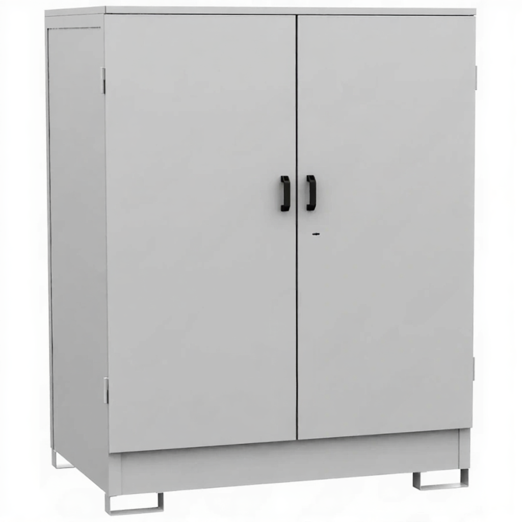- Повышенная безопасность и соответствие нормам — изготовлен из химически стойких материалов, часто оснащен системой вентиляции, поддоном для сбора проливов и самозакрывающимися дверцами с замком, что соответствует требованиям правил хранения опасных веществ (ПБ, ГОСТ).