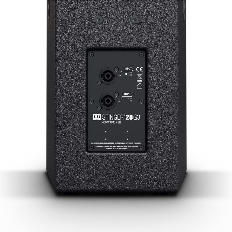 Корпус Bass-Reflex выполнен из прочной березовой фанеры. Эластичное покрытие из полимочевины гарантирует надежность и долговечность. Отличительными особенностями STINGER 28 G3 являются стальная решетка гриль, «стакан» под стойку с разными углами наклона и удобные эргономичные ручки для комфортной переноски. Система STINGER 28 G3 — универсальное решение для профессионального применения на сцене и в инсталляциях.